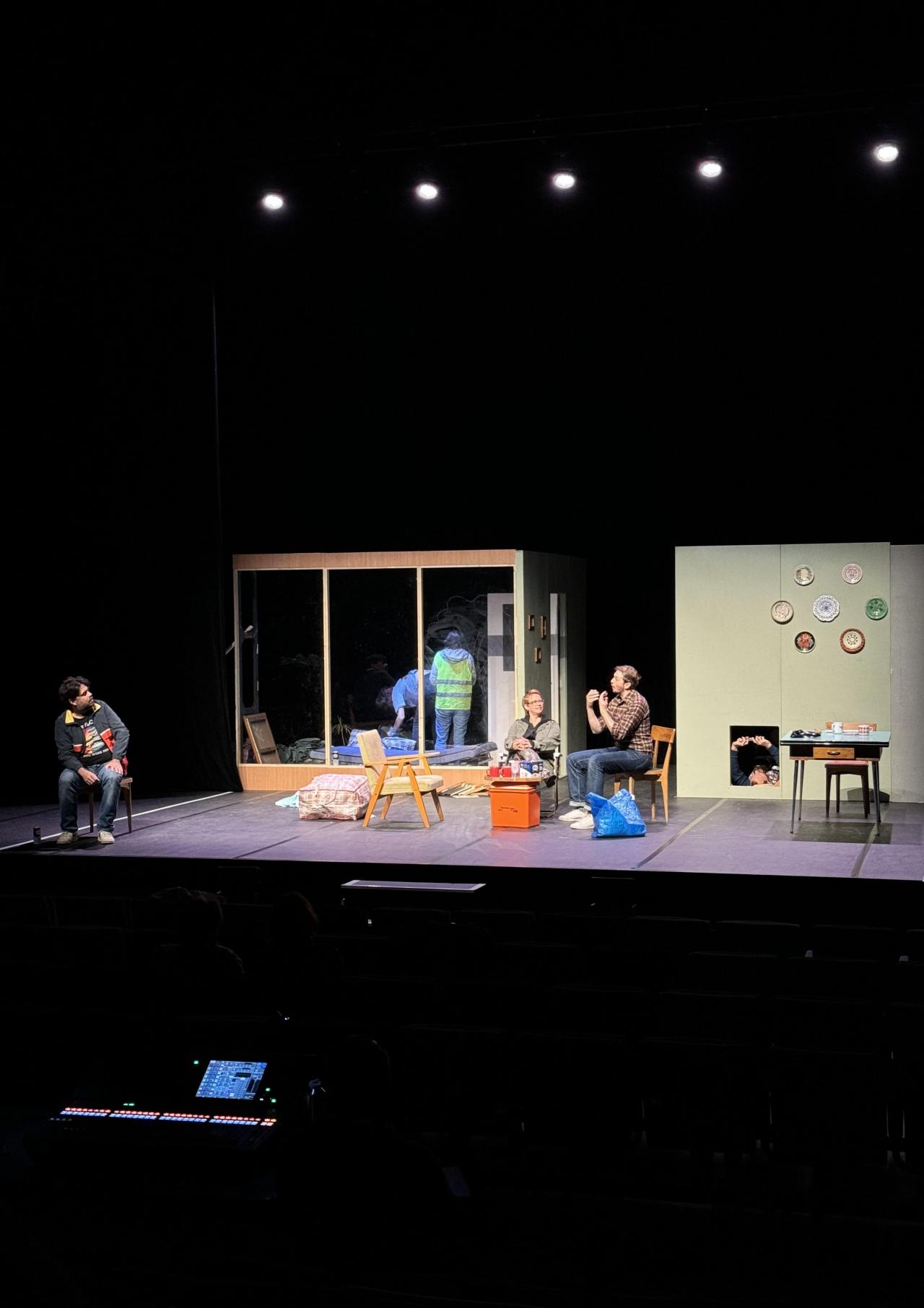 À La Balise, alors que la préparation de la soirée de présentation de saison 24 25 se prépare, les équipes de la Compagnie l’Origine des Autres, basée à Bretignolles sur Mer, profitent de la fin de saison et de la disponibilité du plateau pour investir la salle ! C’est leur deuxième temps de résidence autour de la création de leur nouveau spectacle Mais qu’est-ce qu’ils font là. Pendant une semaine, comédiens et techniciens travaillent au plateau sur la mise en scène du texte.
